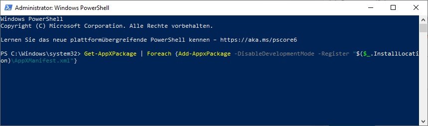 Get-AppXPackage | Foreach {Add-AppxPackage -DisableDevelopmentMode -Register „$($_.InstallLocation)\AppXManifest.xml“}