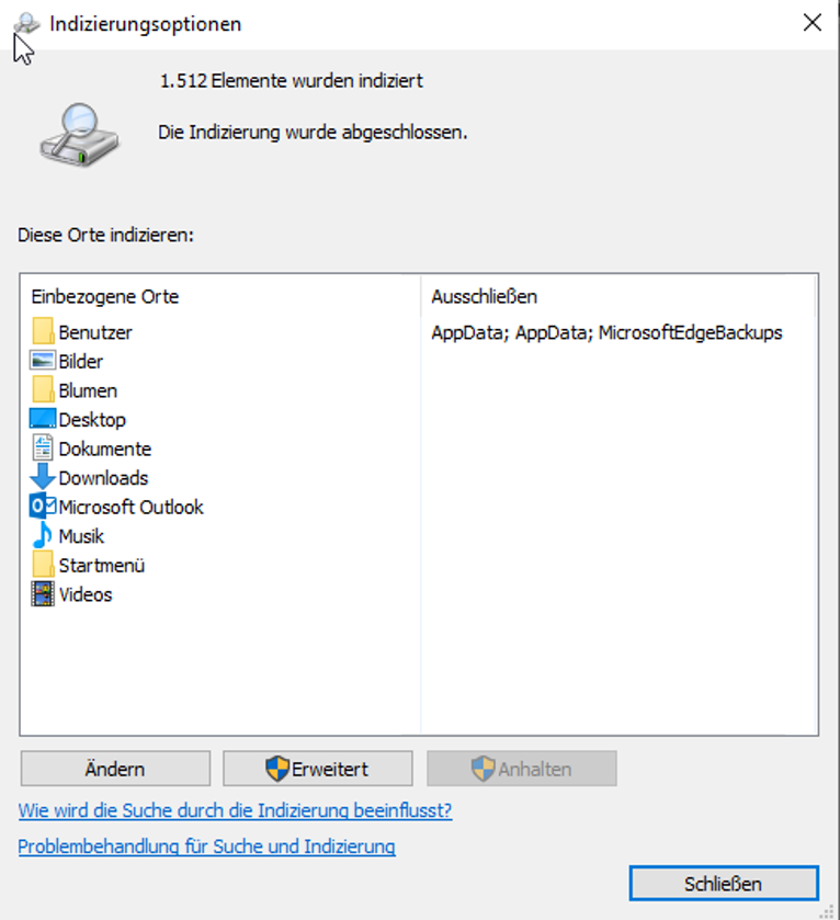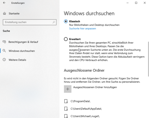 Sie können in den Sucheinstellungen aber auch „erweitert“ wählen, womit alle Quellen vom lokalen PC indiziert werden. Darunter findet sich eine Ausschlussliste für Ordner, welche von der gesamten Indizierung ausgenommen werden sollen.