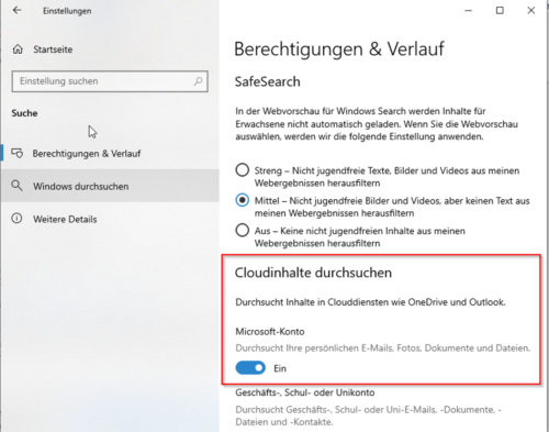 Die Suche von Windows 10 berücksichtigt auch Inhalte, welche mit Ihrem Microsoft-Konto verknüpft sind, beispielsweise in Outlook.com oder OneDrive. Sie können in den Sucheinstellungen aber festlegen, dass diese Inhalte nicht berücksichtigt werden. Hier findet sich auch eine Möglichkeit, den SafeSearch-Filter den eigenen Wünschen anzupassen, um potenziell nicht jugendfreie Inhalte aus der Websuche herauszufiltern.