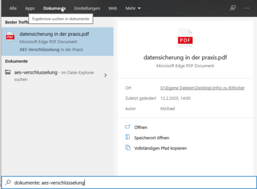 Die Inhaltssuche funktioniert beispielsweise auch für PDF-Dokumente. In dem Beispiel findet sich der Begriff AES-Verschlüsselung innerhalb eines PDF-Dokuments.