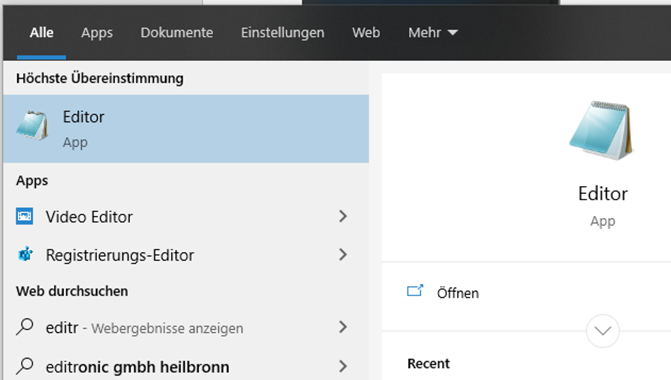 Das Startmenü von Windows 10 bietet gegenüber dem klassischen Startmenü bis Windows 7 keine Möglichkeit, Programme in Ordnern zu gruppieren, sofern man auf Kacheln verzichtet, die aber nur im Bereich Start angeheftet werden können. Mit der Suche in Windows 10 können Sie aber das zunächst unübersichtliche Startmenü von Windows 10 ignorieren und direkt den Namen des Programms eintippen, welches Sie starten möchten. Ob Sie dabei beispielsweise Notepad oder Editor eingeben, spielt für Windows keine Rolle. Es wird immer der richtige Treffer zum klassischen Texteditor von Windows angezeigt.