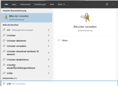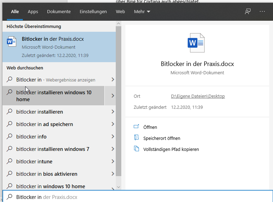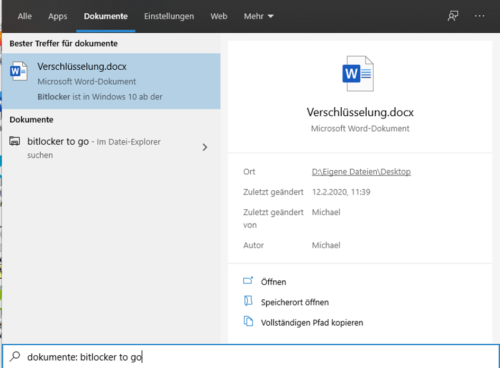 Die Suche berücksichtigt dabei auch den Dokumentinhalt und kann den Inhalt vieler Dateitypen, für die ein Import-Filter vorliegt, indizieren. Um in den Inhalten von Dokumenten zu suchen, müssen Sie auf den Abschnitt Dokumente in der Suche von Windows 10 wechseln. In dem folgenden Beispiel wurde nach dem Begriff „Bitlocker to go“ gesucht, welcher sich in einem Word-Dokument findet.
