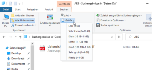 Der Explorer bietet auch eine Suche nach großen Dateien.