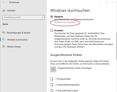 In den Einstellungen können Sie die Suchorte für die Suche von Windows anpassen.