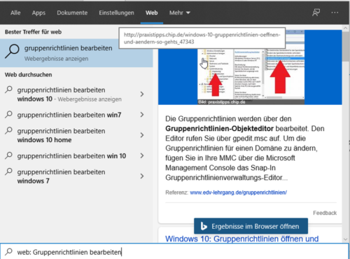 Die Suche im Startmenü berücksichtigt auch eine Websuche über Bing. Andere Suchmaschinen wie Google können leider nicht verwendet werden. Sie können auf einen der Suchbegriffe unterhalb „Web durchsuchen“ klicken, worauf die Suchmaschine Bing mit dem ausgewählten Suchbegriff über den Standardbrowser gestartet wird.