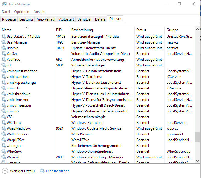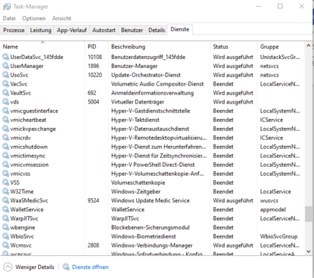 Der Task-Manager von Windows 10 zeigt in der erweiterten Ansicht über die Registerkarte „Dienste“ bereits an, welche Dienste auf Ihrem PC aktiv sind. Die Liste der Dienste kann sehr lang sein.
