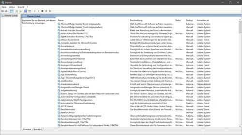Die Verwaltungskonsole „Dienste“ zeigt alle registrierten Dienste auf Ihrem System an und ergänzt dies mit der Beschreibung zum Dienst, Status und dem Starttyp, also wie der Dienst angemeldet wird.