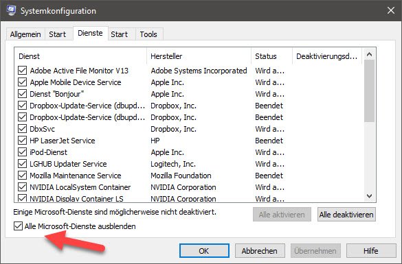 Das Tools „msconfig“, welches sich über Start -> Ausführen aufrufen lässt, bietet eine kleine Hilfestellung. Sie können sich hier unter der Registerkarte Dienste über eine Checkbox alle Dienste anzeigen lassen, welche nicht von Microsoft stammen, damit zumindest nicht direkter Teil des Betriebssystems sind.