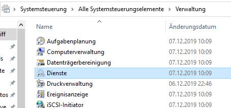Die Verwaltung der Dienste erfolgt über die Verwaltungskonsole unter Dienste, welche sich auch direkt über „Dienste öffnen“ im Task-Manager anzeigen lässt.