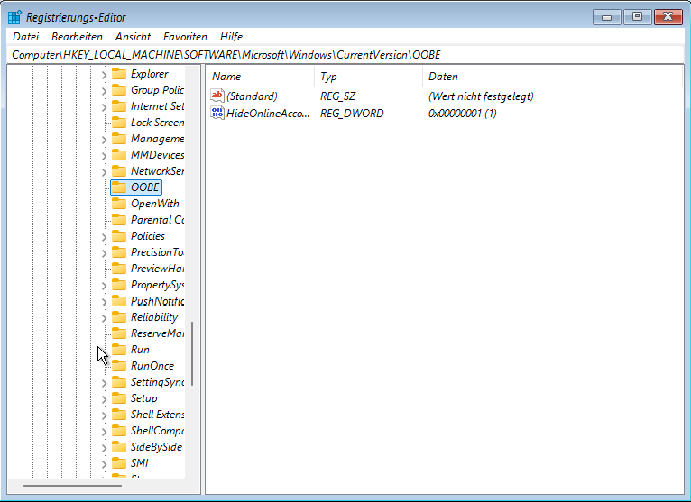 Optional können Sie auch über die Eingabeaufforderung mit „regedit“ den Registry-Editor starten und im Pfad HKEY_LOCAL_MACHINE\Software\Microsoft\Windows\CurrentVersion\OOBE den Wert HideOnlineAccountScreens als DWORD32-Wert mit dem Zahlenwert 1 anlegen.