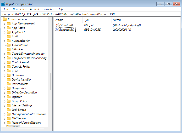 Navigieren Sie dann in den Pfad HKLM\SOFTWARE\Microsoft\Windows\CurrentVersion\OOBE. OOBE müssen Sie ggf. als Schlüssel erst ablegen.
