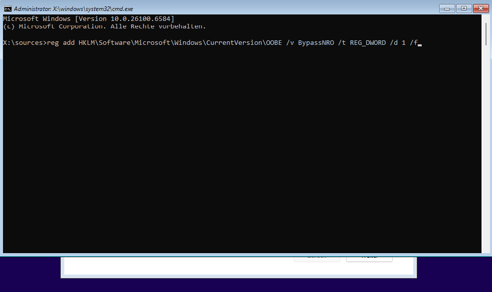 reg add HKLM\SOFTWARE\Microsoft\Windows\CurrentVersion\OOBE /v BypassNRO /t REG_DWORD /d 1 /f