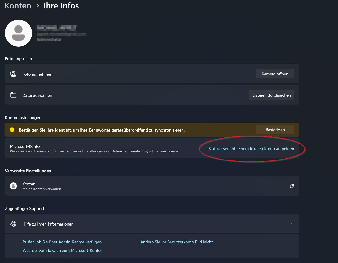 Wenn Sie Windows 11 bereits mit einem Microsoft-Konto installiert haben, können Sie jederzeit auf ein lokales Konto wechseln, ohne dass dabei Daten verloren gehen.