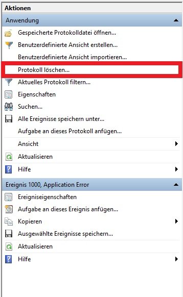 Das Ereignisprotokoll wird im Laufe der Zeit immer umfangreicher und dadurch natürlich auch gleichzeitig unübersichtlicher. Aus diesem Grund schadet es nicht, wenn Sie es in regelmäßigen Abständen bereinigen. Das geht ganz einfach über den Link „Protokoll löschen“ in der rechten Spalte.