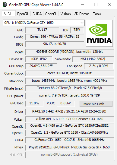 Das Tool zeigt zu Ihrer Grafikkarte Informationen wie GPU-Typ, BIOS, Speicher sowie Echtzeitdaten wie die GPU-Auslastung, GPU-Temperatur, Lüfter-Geschwindigkeit und Spannung an. Auf weiteren Registerkarten finden Sie Informationen zum verwendeten Treiber und den Schnittstellen Vulkan, OpenGL, OpenCL, CUDA und PhysX. Als Besonderheit findet sich in dem Tool auch eine kleine Auswahl von 3D-Demos, welche Sie für Benchmark-Messungen oder zum Test der Systemstabilität verwenden können.