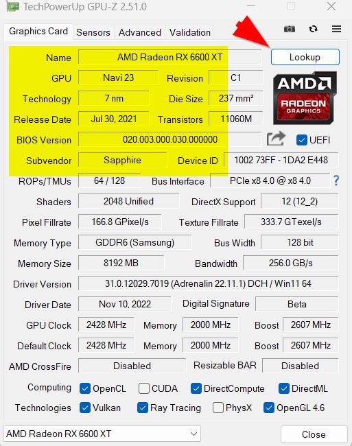 Was CPU-Z für die Diagnose zum verwendeten CPU ist, deckt GPU-Z für die Grafikkarte ab. Die Freeware, welche direkt startbar ist und keine Installation benötigt, zeigt Ihnen über vier Registerkarten alle erdenklichen Informationen zu Ihrer Grafikkarte an. In unserem Beispiel sehen wir jetzt, dass die Grafikkarte die AMD-GPU mit der internen Bezeichnung Navi 23 verwendet, die Grafikkarte selbst aber von Sapphire stammt. Wenn Sie auf den Button „Lookup“ klicken, führt Sie das Tool zu einer Webseite, auf welcher Sie weitere Informationen zur konkret verbauten Grafikkarte bekommen, in unserem Fall eine Sapphire NITRO+ RX 6600 XT.