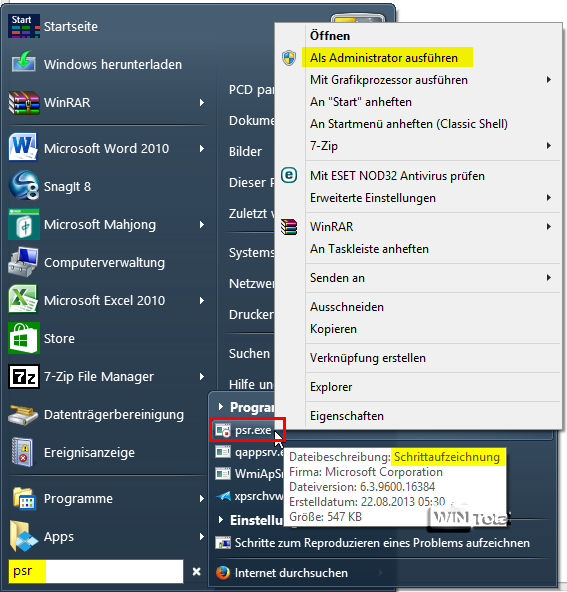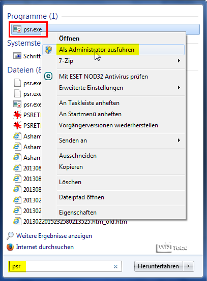 Über den Startbutton auf dem Desktop geben Sie im Suchfeld psr ein und klicken den Eintrag psr.exe rechts an, um das Tool als Administrator auszuführen. Mit der Schaltfläche „Aufzeichnung starten“ startet die Aufnahme – alle nun folgenden Schritte und Klicks werden protokolliert.