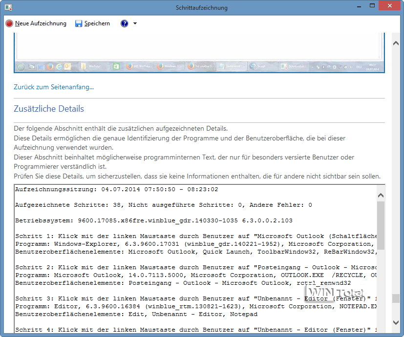 Windows 8.1 – oberer Teil des Schrittaufzeichnungsberichts