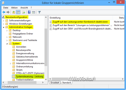 Benutzerkonfiguration – Administrative Vorlagen – System – „Systemsteuerung-Leistung“ – „Zugriff auf den Leistungscenter-Kernbereich deaktivieren“ sollte auf „Nicht konfiguriert“ stehen.