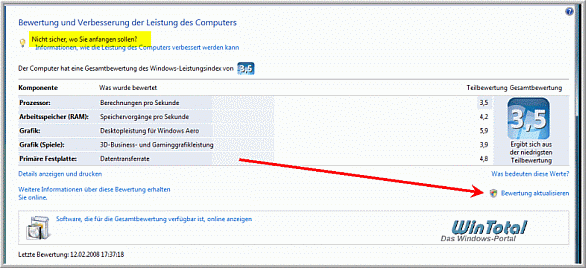 Die Liste der Komponente fehlen, sowie der Link „Bewertung aktualisieren“ – unter Windows 7/Windows 8 der Link „Windows-Leistungsindex“ – „Bewertung erneut ausführen„. Im Fenster steht nur die Überschrift: „Bewertung und Verbesserung der Leistung des Computers“ darunter: „Nicht sicher, wo sie anfangen sollen?“ und das Datum der letzten Messung. Alle Links, Grafiken und Infos zur Hardware sind verschwunden. Auch der Tipp mit „WinSat“ funktioniert hier nicht.