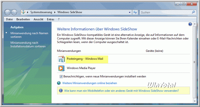 In der Systemsteuerung – »Windows SideShow« alle Häkchen entfernen, die unter „Windows Mail“ aufgeführt sind.