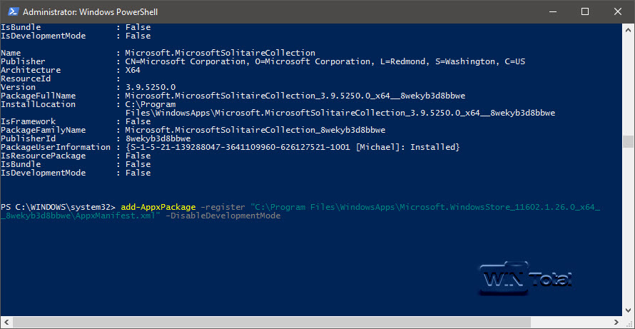 Statt Platzhalter ist dabei der Eintrag von oben, in unserem Fall „Microsoft.WindowsStore_11810.1001.12.0_x64__8wekyb3d8bbwe“, zu verwenden.