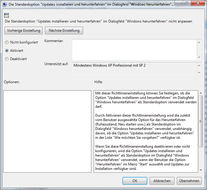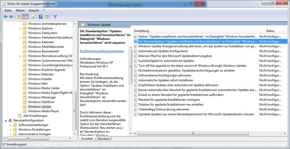 Wer die Prof.-Version hat, kann die Option auch ganz einfach über die Gruppenrichtlinie (gpedit.msc) aktivieren. Unter „Computerkonfiguration“ (für das System) bzw. „Benutzerkonfiguration“ (für den Benutzer) müssen Sie dazu bei „Administrative Vorlagen“ – „Windows-Komponenten“ – „Windows Update“ – Die Standardoption „Updates installieren und herunterfahren aktivieren.