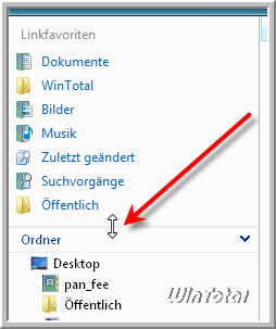 Mit der Maus über die Trennlinie oberhalb der Beschriftung „Ordner“ fahren bis ein Doppelpfeil sichtbar wird und mit der linken Maustaste festhalten, danach mit gedrückter Maus die Trennlinie ganz nach oben ziehen bis der Linkfavoriten-Ordner nicht mehr sichtbar ist.