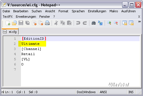 Liegt im Unterverzeichnis sources die Datei mit dem Namen ei.cfg, können Sie sogar eine beliebige Version von Windows installieren. Wenn Sie diese mit einem Texteditor öffnen, werden Sie schnell erkennen, dass die zu installierende Edition im Klartext hinterlegt ist.