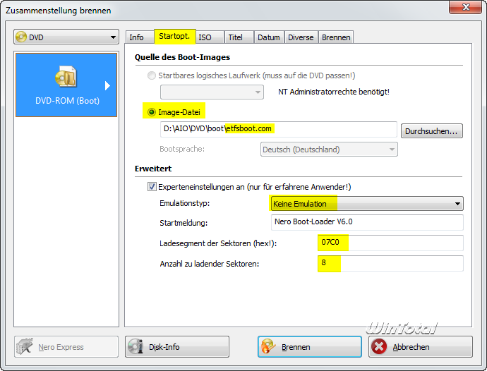 Die Datei install.wim ist bei Windows 7 x64 größer als 2 GB und Nero zeigt eine Fehlermeldung, dass „DVD-Rom (Boot)“ so mit der zu großen install.wim nicht zu brennen geht. Mit WinOnCD (ISO9660 / ISO/Joliet) gibt es keine Probleme (seit Version 3.8 kann WinOnCD problemlos Dateien brennen, die größer sind als 4 GB).