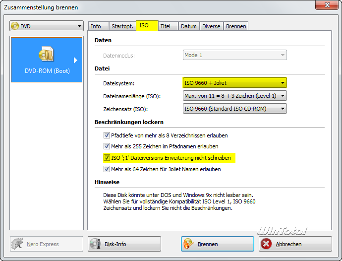 - „Beschränkungen lockern“ ISO;1-Dateiversions-Erweiterung nicht schreiben (bei ImgBurn = ;1‘ Versionsnummer nicht hinzufügen)