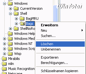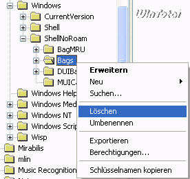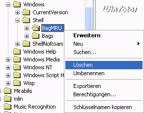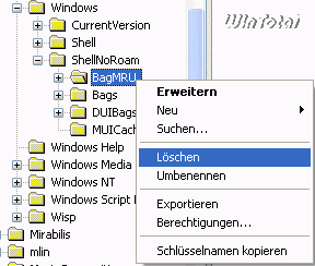 Den Unterschlüssel BagMRU mit rechter Maustaste anklicken und aus dem erscheinenden Menü den Punkt Löschen wählen.