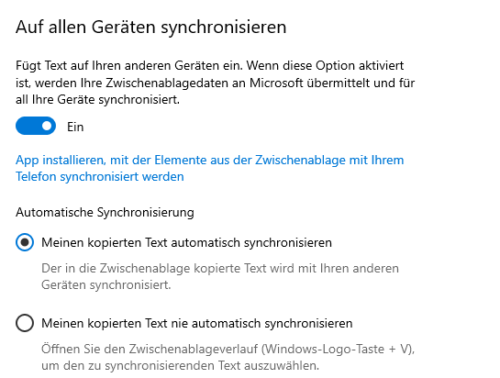 Mit dieser Einstellung werden alle Inhalte der Zwischenablage automatisch mit allen Geräten synchronisiert, welche mit dem gleichen Microsoft-Konto verbunden sind - Meinen kopierten Text nie automatisch synchronisieren