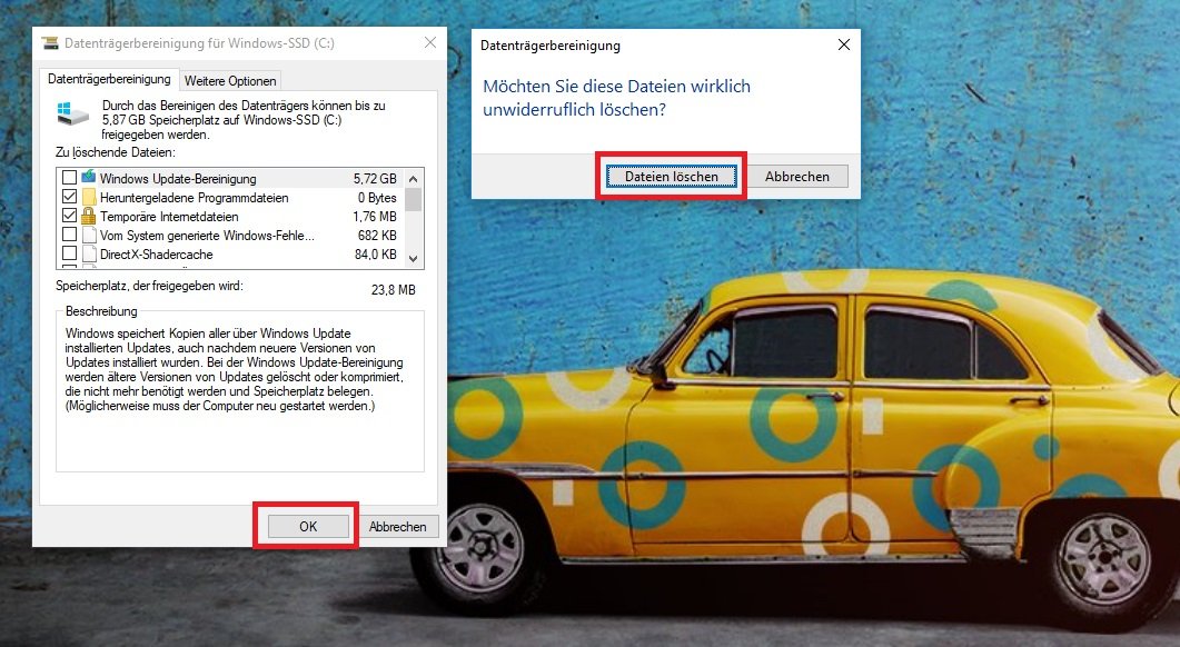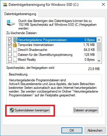 - Windows erkundigt sich vorsichtshalber noch einmal, ob Sie die Daten auch wirklich löschen möchten. Bestätigen Sie mit „Dateien löschen“ um die Bereinigung zu starten.