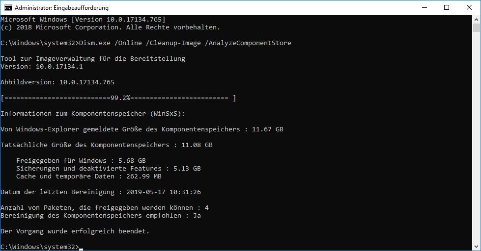 Führen Sie ein weiteres Mal Schritt 1 aus, um zu sehen, ob das WinSxS-Verzeichnis auch wirklich verkleinert wurde.