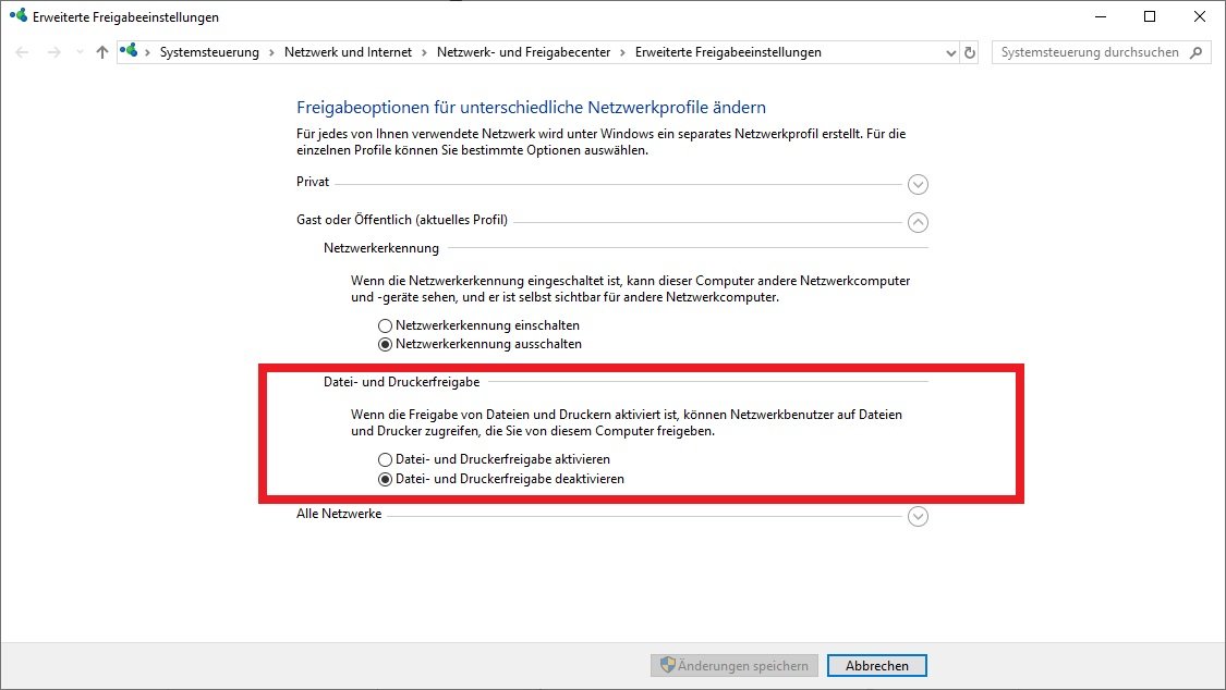 2.2.1. Datei- und Druckerfreigabe deaktivieren
