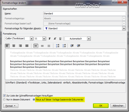 Es erscheint wieder das vorherige Fenster, hier wird der Punkt Neue auf dieser Vorlage basierende Dokumente aktiviert und abermals mit [OK] bestätigt.