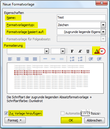 Wenn Sie lieber eine Formatvorlage mit eigener Schriftfarbe anlegen möchten, öffnen Sie auch ein neues Dokument. Wählen Sie unter der Registerkarte „Format“ den Menüpunkt „Formatvorlagen und Formatierung“ aus. Im rechten Aufgabenbereich klicken Sie anschließend auf die Schaltfläche „Neue Formatvorlage„. Im Feld „Name“ müssen Sie eine Bezeichnung für die neue Formatvorlage angeben. Wählen Sie im Feld „Formatvorlagentyp“ den Eintrag „Zeichen“ aus und im Feld „Formatvorlage basiert auf:“ die Auswahl von „(zugrunde liegende Eigenschaften)„. Stellen Sie nun im Bereich „Formatierung“ die gewünschte Schriftfarbe ein. Alle anderen Felder lassen Sie unverändert. Aktivieren Sie das Kontrollkästchen „Zur Vorlage hinzufügen“ und klicken Sie dann auf [OK]. Das Dokument können Sie danach schließen, ohne die Änderungen speichern zu müssen. Nur beim Beenden von Word müssen Sie darauf achten, dass die Änderungen an der Standardvorlage Normal.dot gespeichert werden.