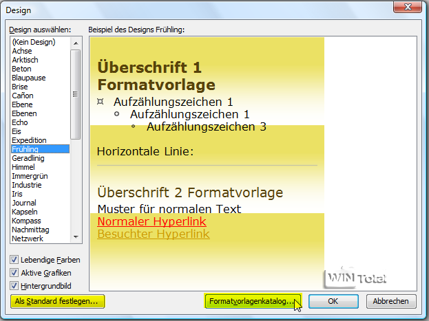 Wenn Sie ein vordefiniertes Design wünschen, öffnen Sie ein neues Dokument, wählen unter der Registerkarte „Format“ den Menüpunkt „Design“ an, wählen ein Design aus, gehen auf „Als Standard festlegen“ und bestätigen mit [OK].