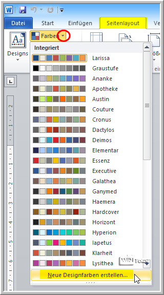 2007/2010: In der Gruppe „Designs“ unter der Registerkarte „Seitenlayout“ klicken Sie auf „Farben“ und wählen aus dem Dropdown-Menü „Neue Designfarben erstellen“ an.