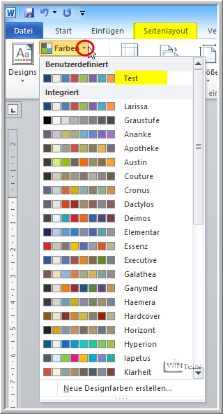 Word bietet neben diversen Designfarben unter „Seitenlayout“ – „Designs“ (Word 2007/2010) bzw. „Entwurf“ – „Dokumentformatierung“ (Word 2013) auch eine automatisch erstellte Palette von Schattierungen der Hauptfarben an. Designfarben stehen nur in Word 2007, 2010 und 2013 zur Verfügung und dort auch nur, wenn Dokumente im neuen Dateiformat (docx) bearbeitet werden. Aber auch in alten doc-Formaten können Sie über die Formatvorlage eigene Schriftfarben definieren. Sie haben auch die Möglichkeit vordefinierte Designs auszuwählen, wenn Ihnen das schon reicht.