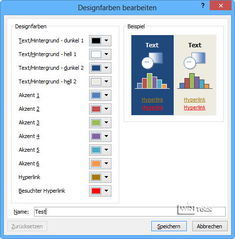 Nachdem Sie sich Ihre Farben zusammengestellt haben, müssen Sie noch einen Namen vergeben und auf „Speichern“ klicken.