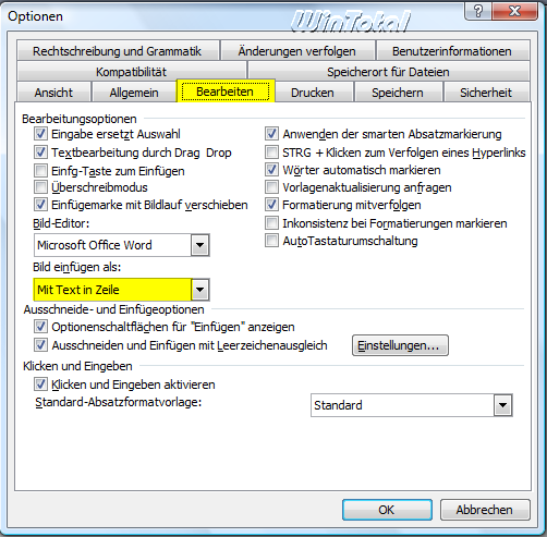 Bilder einfügen als = von „Passend“ auf Mit Text in Zeile umstellen