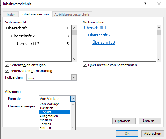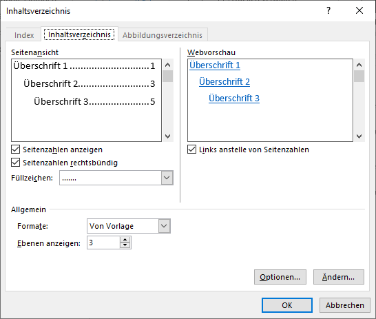 Für ein eigenes Layout vom Inhaltsverzeichnis, beispielsweise mit anderer Schriftart oder Größe, klicken Sie bei Formate „Von Vorlage“ und dann auf den Button Ändern rechts.