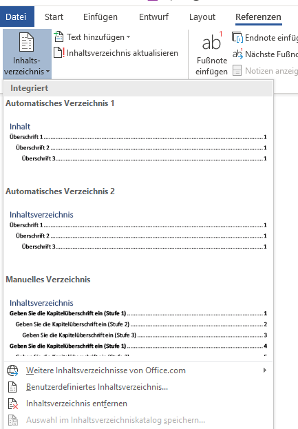 Microsoft Word bietet bis Office 2010 unter Verweise und ab Office 2013 unter Referenzen den Assistenten für ein Inhaltsverzeichnis.