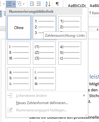 Wenn Sie Ihre Überschriften als solche formatiert haben, können Sie diese auch ganz einfach nummerieren. Sie finden hierzu im Menüband den Button Nummerierung einfügen. Markieren Sie die erste Überschrift und wählen Sie die Funktion Nummerieren. Hier haben Sie die Wahl zwischen verschiedenen Darstellungsformen mit arabischen Zahlen, römischen Ziffern und sogar Buchstaben.