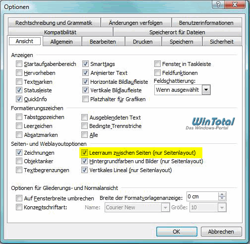 Extras – Optionen – Ansicht – Leerraum zwischen Seiten aktivieren (nur Seitenlayout) aktivieren.
