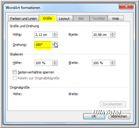 Gewünschte Schriftart und Schriftgrad auswählen und im Textfeld den Text erstellen. Jetzt mit der rechten Maustaste auf den Text klicken – es öffnet sich das Kontextmenü – „WordArt formatieren…“ und unter der Registerkarte „Größe“ unter „Drehung“ 180 Grad einstellen – [OK].