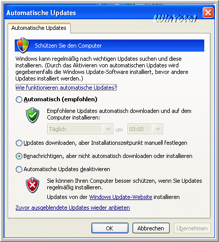 2 = Benachrichtigen, aber nicht automatisch downloaden oder installieren.