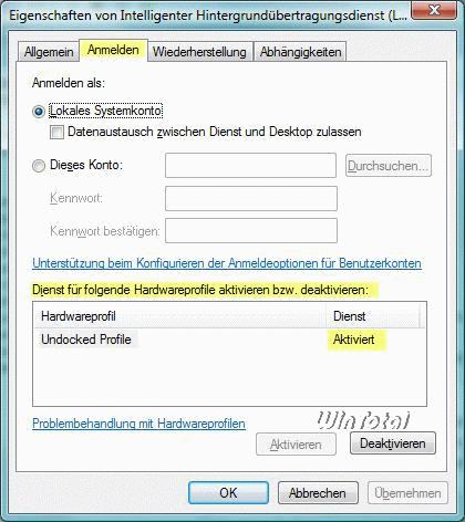 - Auf die Registerkarte „Anmelden“ klicken und sich vergewissern, dass der Dienst in jedem aufgelisteten Hardwareprofil aktiviert ist. Wenn der Dienst in einem oder mehreren Hardwareprofilen deaktiviert ist, klickt man auf das Hardwareprofil und auf „Aktivieren“ – „Übernehmen.“